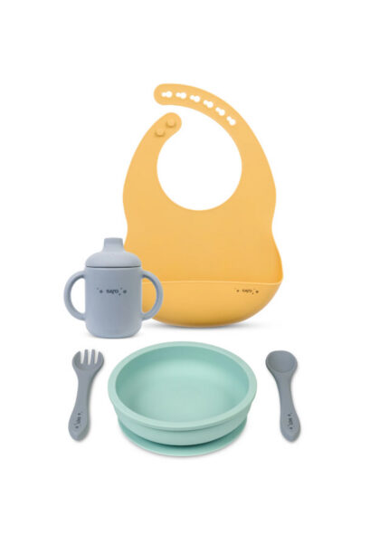 Fabricado em silicone de grau alimentar, um material ecológico, antibacteriano e flexível, este conjunto foi pensado para acompanhar o bebé nas primeiras fases da alimentação de forma segura e confortável.