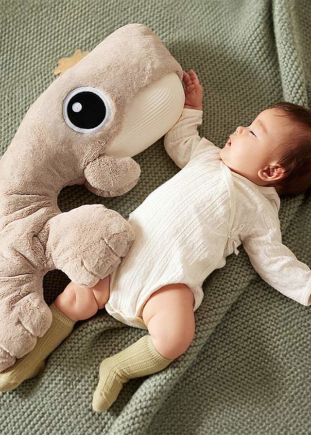 Com recursos adicionais, como gravação da voz dos pais e uma vibração suave da barbatana caudal que imita o ato de ser segurado nos braços, a baleia proporciona uma sensação de segurança e uma presença gentil.